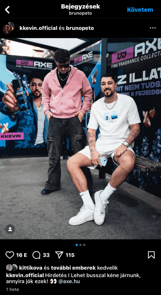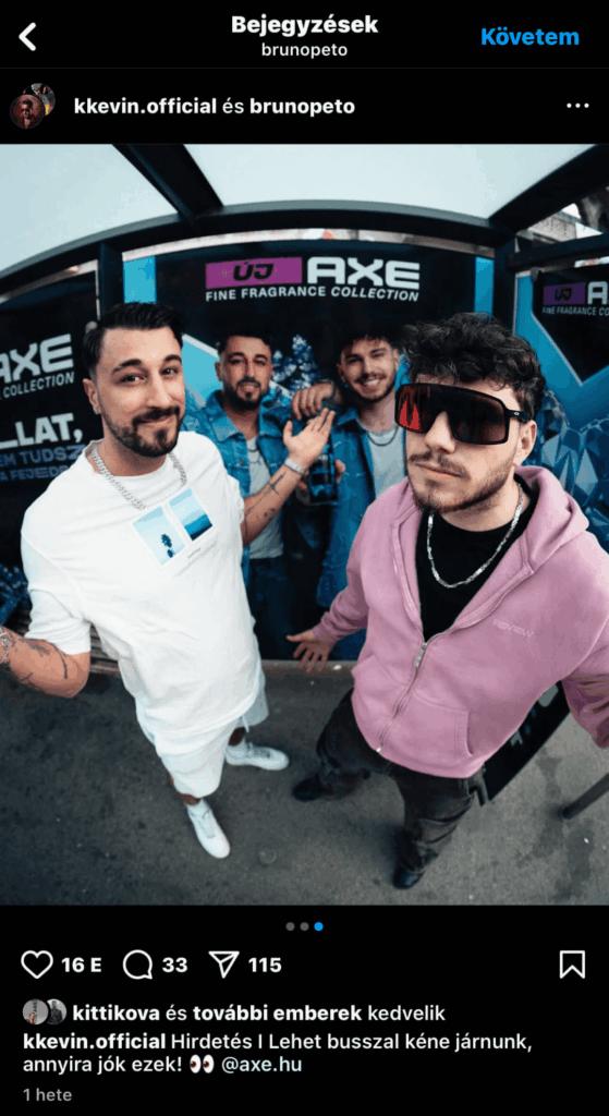Az AXE kommunikáció nem ér véget a kampánnyal. Az egész éves social tartalomgyártásban KKevin, Brúnó, Miskovits Marci, Vareha Petra, Komjáthi Csabi, Nagy Beni és Gelencsér Timi is velünk dolgoznak. Ezek a közös munkák nem csak kampányszerűek – kreatív ötletelések, TikTok-videók, interjúk, és street contentek is készülnek hónapról hónapra.
